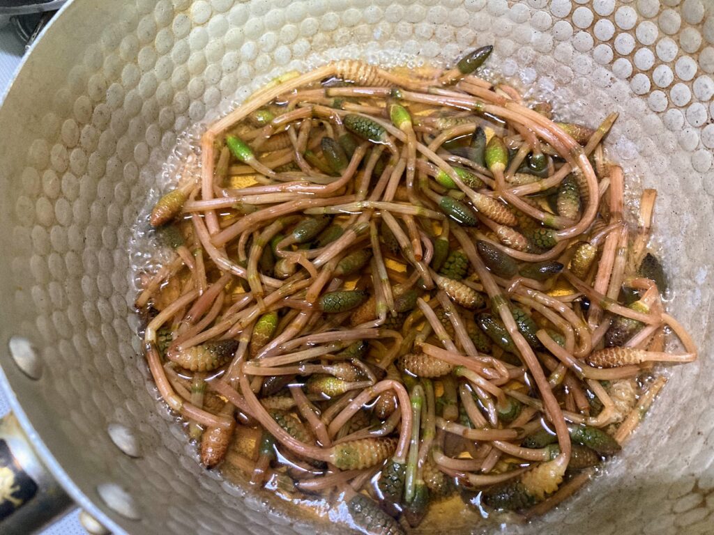 ②鍋にだし汁と調味料を入れ、つくしをいれてさっと煮る