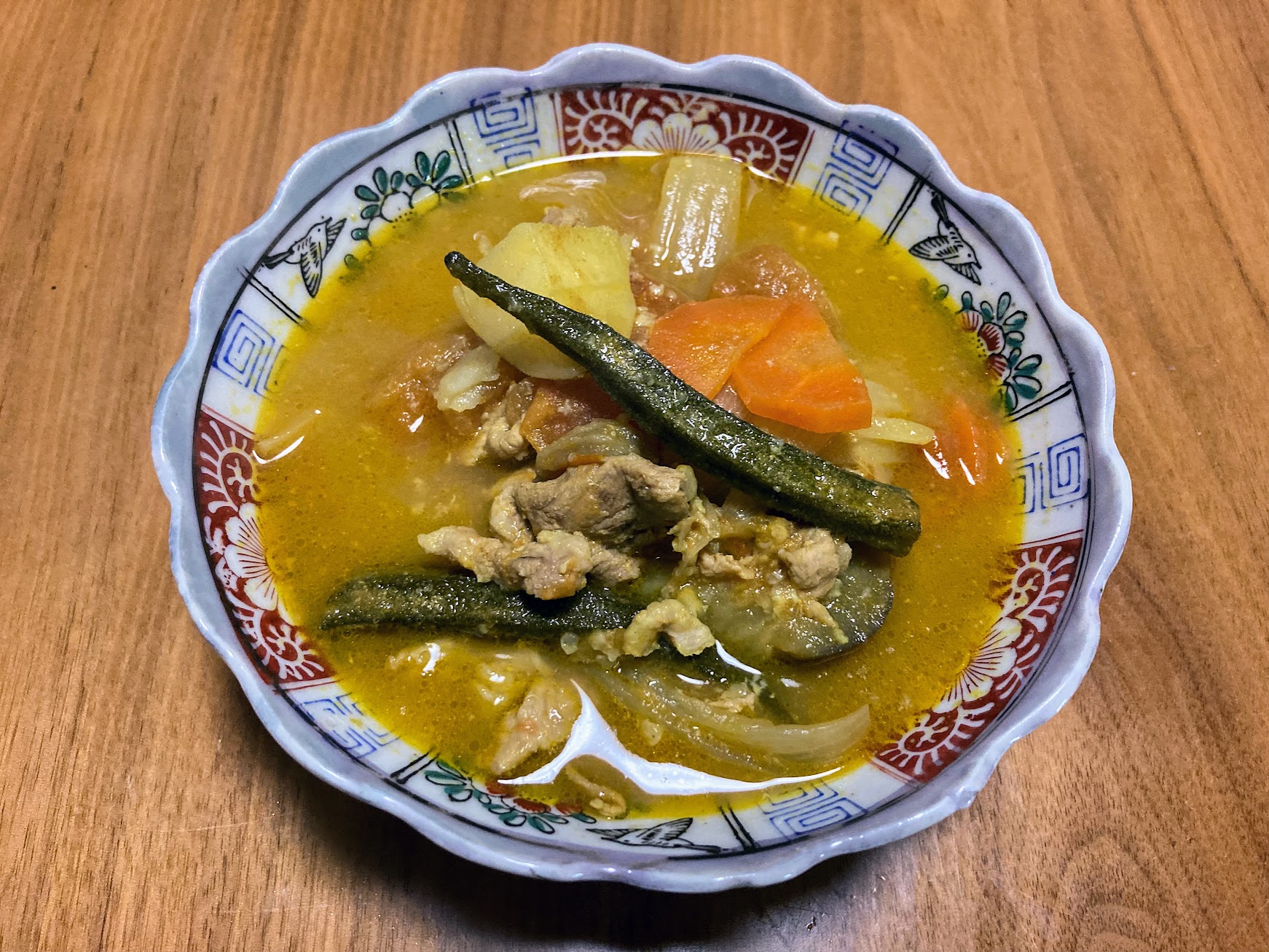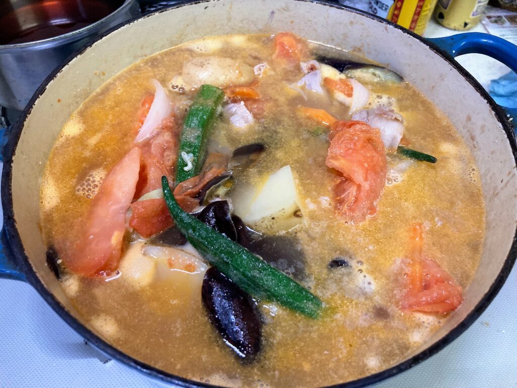ビルマ汁とはトマトやナスなどの夏野菜と、地元産のじゃがいもや人参を煮込んだものに、カレー粉で風味をプラスした夏の家庭料理です。